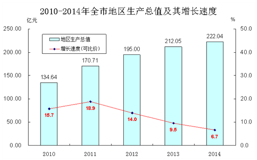 初步核算,2014年全市實現地區生產總值222.04億元,按可比價格計算,比上年增長6.7%。其中,第一產業實現增加值36.65億元,增長4.7%;第二產業實現增加值110.3億元,增長7.8%;第三產業實現增加值75.09億元,增長5.9%。全市人均生產總值49970元,比上年增長7.3%。