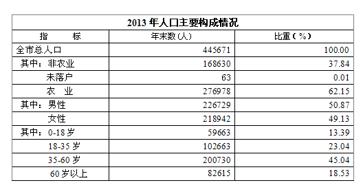 年末全市總?cè)丝跒?45671人,比上年減少2183人。全年出生人口3811人,出生率為8.53 ‰,比上年上升1.16個(gè)千分點(diǎn);死亡人口4039人,死亡率為9.04 ‰,比上年下降3.18個(gè)千分點(diǎn);人口自然增長(zhǎng)率為-0.51‰,比上年上升4.34個(gè)千分點(diǎn)。全市非農(nóng)業(yè)人口168630人,未落戶人口63人,農(nóng)業(yè)人口276978人;市區(qū)(3街)人口為97561人。