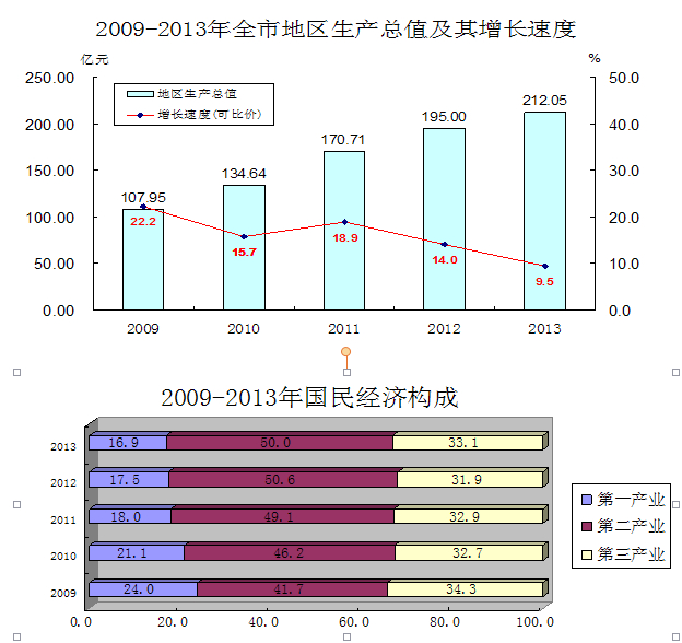 初步核算,2013年全市實(shí)現(xiàn)地區(qū)生產(chǎn)總值212.05億元,按可比價(jià)格計(jì)算,比上年增長(zhǎng)9.5%。其中,第一產(chǎn)業(yè)實(shí)現(xiàn)增加值35.78億元,增長(zhǎng)4.3%;第二產(chǎn)業(yè)實(shí)現(xiàn)增加值106.02億元,增長(zhǎng)10.9%;第三產(chǎn)業(yè)實(shí)現(xiàn)增加值70.25億元,增長(zhǎng)10.0%。全市人均生產(chǎn)總值47464元,比上年增長(zhǎng)10.2%。2013年國(guó)民經(jīng)濟(jì)三次產(chǎn)業(yè)結(jié)構(gòu)比為16.9:50.0:33.1。第一、二、三產(chǎn)業(yè)對(duì)經(jīng)濟(jì)增長(zhǎng)的貢獻(xiàn)率分別為8.0%、59.7%和32.3%。