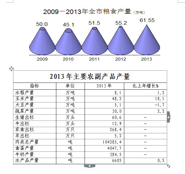 2013年全市實(shí)現(xiàn)農(nóng)林牧漁業(yè)總產(chǎn)值66.72億元,比上年增長(zhǎng)11.9 %,其中:農(nóng)產(chǎn)品產(chǎn)值39.33億元,增長(zhǎng)14.3 %;畜產(chǎn)品產(chǎn)值19.53億元,增長(zhǎng)10.0%。