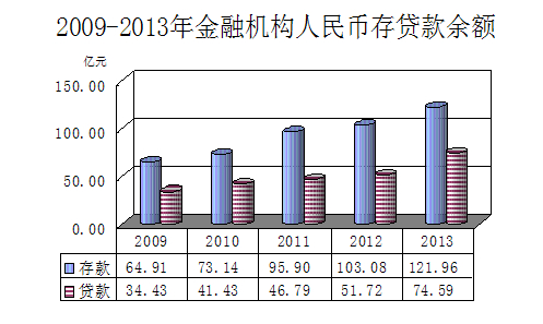 2013年末,全部金融機(jī)構(gòu)各項(xiàng)存款余額(人民幣,下同)121.96億元,比年初增加18.89億元,其中:城鄉(xiāng)居民儲(chǔ)蓄存款余額80.97億元,比年初增加13.31億元。全部金融機(jī)構(gòu)各項(xiàng)貸款余額74.59億元,比年初增加22.87億元,其中:短期貸款37.17億元,比年初增加9.11億元;中長(zhǎng)期貸款37.42億元,比年初增加15.76億元。
