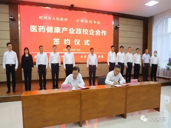 簽約儀式上,與會人員共同觀看了吉林醫藥學院宣傳片《杏林華章》;市長王威與吉林醫藥學院校長蔡建輝簽訂醫藥健康產業戰略合作協議;吉林醫藥學院藥學院院長孫新與長白山制藥股份有限公司總經理趙國華簽訂校企合作協議;吉林醫藥學院公共衛生學院副院長趙臣與添正生物科技股份有限公司董事長蔡體元簽訂校企合作協議。
